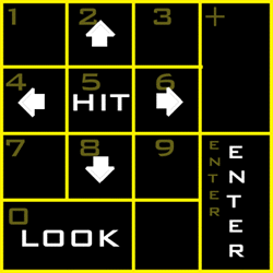 You can enter as many as 10 movements as a set of numbers. As an example 555 [ENTER] will hit 3 times, 88 [ENTER] will move forward twice. For redundancy commands n, s, e, w, go n, go s, go e, go w are recognized to make single movements in cardinal directions. | |